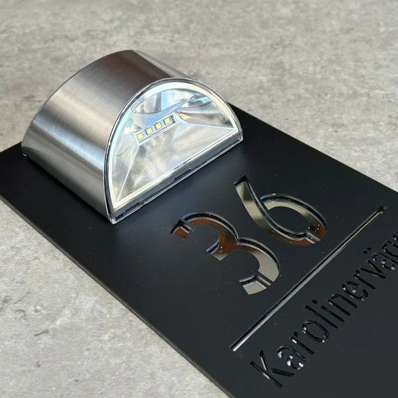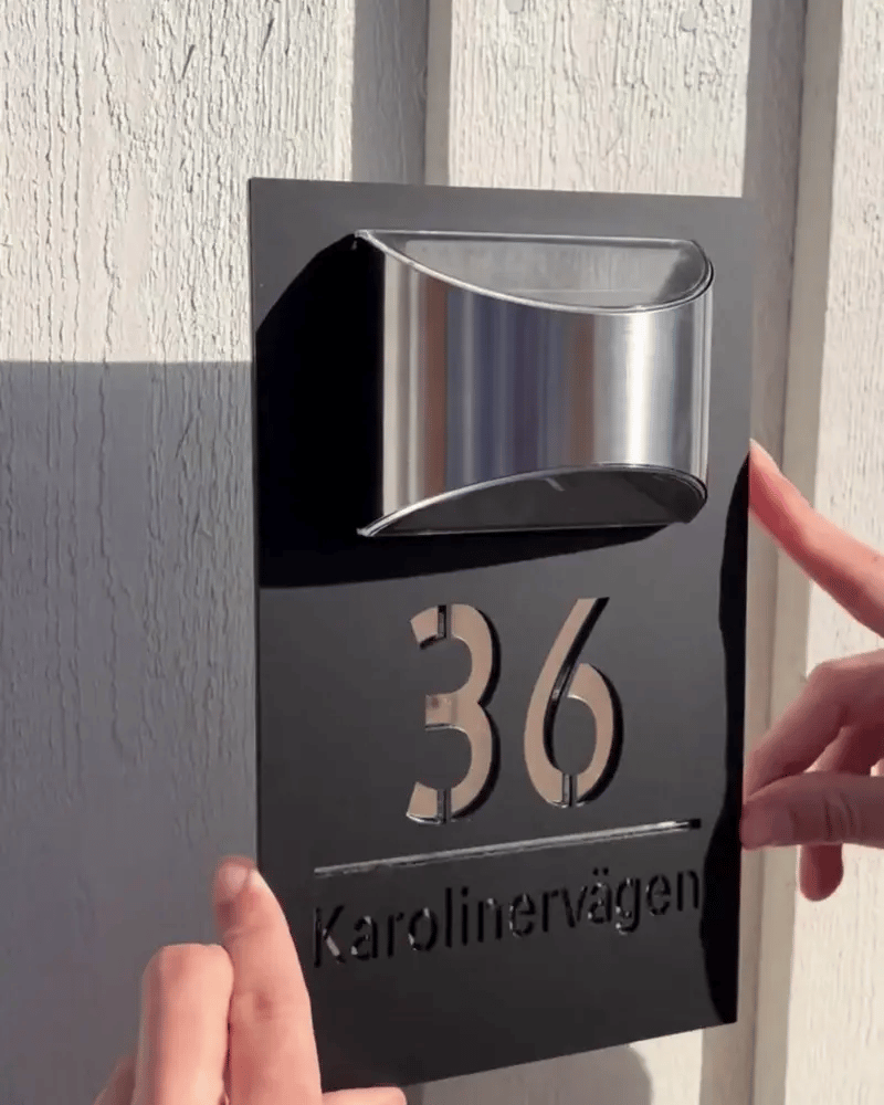 Vores solcelledrevne husnummer er vandtæt og holdbart, perfekt til alle vejrforhold. Du kan tilpasse det med dit eget husnummer og gadenavn. Den indbyggede LED-belysning tænder automatisk om aftenen for bedre synlighed og en varm atmosfære.